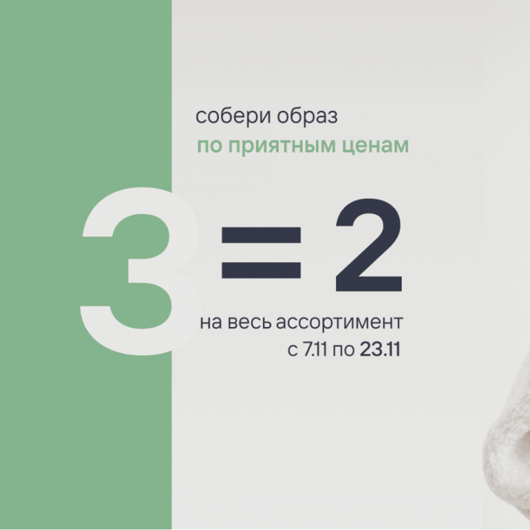 До 23 ноября действует акция 3=2 на весь ассортимент. Бери две вещи, третья - в подарок.