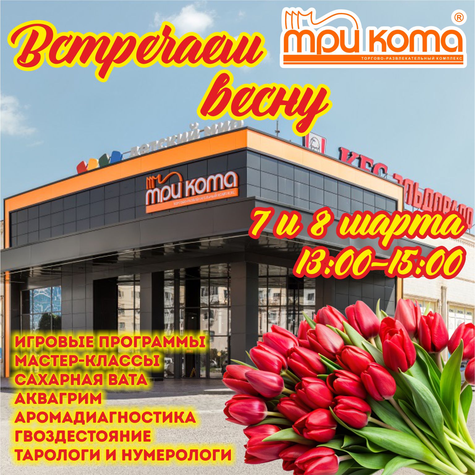 Встречаем весну с ТРК «Три Кота»! 7 и 8 марта с 13:00 до 15:00 встречаем весну и Международный женский день с ТРК «Три Кота»! Для милых женщин проведут бесплатные консультации тарологи и нумерологи! Вас ждут аромадиагностика, гвоздестояние и многое другое! Детей увлекут Read More