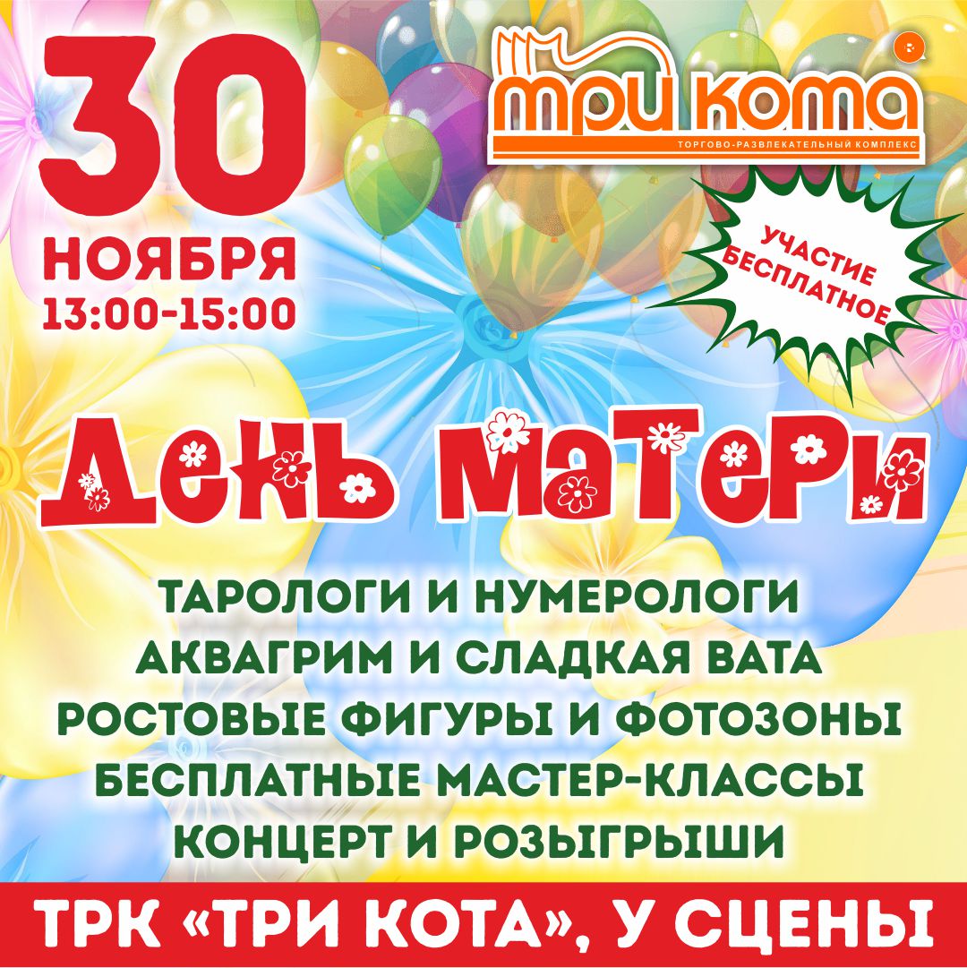 30 ноября с 13:00 до 15:00 ТРК «Три Кота» приглашает посетителей на праздник в честь Дня Матери! Для вас подготовлены бесплатные консультации: — психолога-танцетерапевта Нелли Симоновой, — нумеролога — Карины Сафаровой, — тарологов Дарьи Астафьевой, Марии Гофер и Юлии Аракчеевой, — аромадагностика Read More